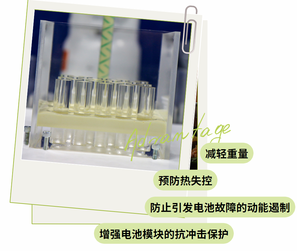 使用发泡胶灌封,填充每个电池之间的空间。不但可以防止热失控和热传播,减少正常使用条件下的机械冲击和振动,更能减轻锂电池重量,可确保更好的安全性、更高的机械稳定性和更好的长期电池性能。