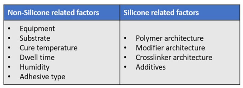基材类型、固化温度、停留时间和湿度会影响有机硅涂层在基材上的固化和锚固。应用所需粘合剂的选择也对释放和锚固特性有重大影响。